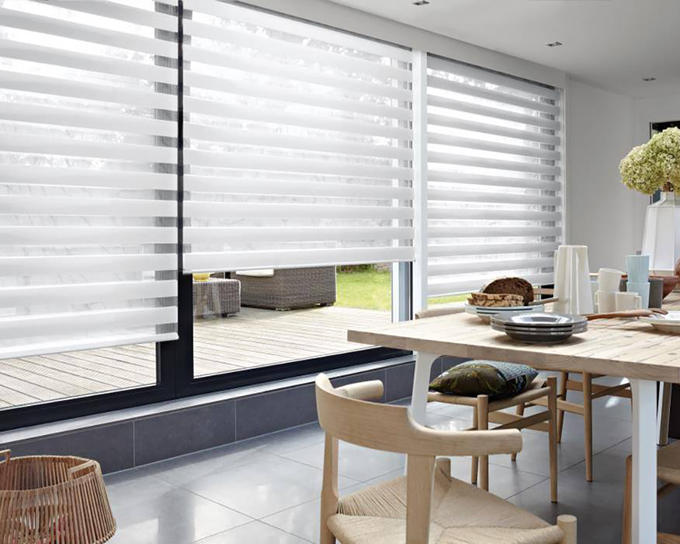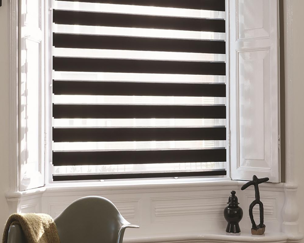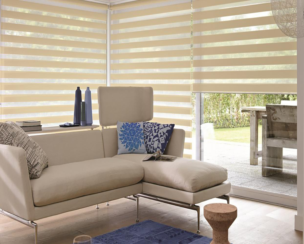 Gracias al novedoso diseño de la tela con franjas horizontales traslucidas y semi-opacas, se logra pasar progresivamente de la transparencia a la privacidad total con solo hacer un pequeño enrollamiento.